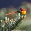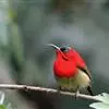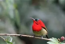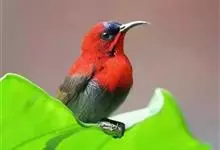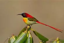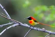火尾太阳鸟为太阳鸟科太阳鸟属的鸟类。体长20厘米,色彩艳丽。雄鸟红色,具形长的艳猩红色中央尾羽。头顶金属蓝色,眼先和头侧黑色,喉及髭纹金属紫色。下体黄色,胸具艳丽的橘黄色块斑。雌鸟灰橄榄色,腰黄,…全部>>