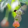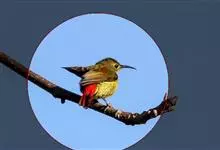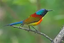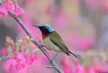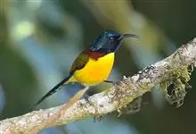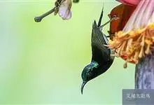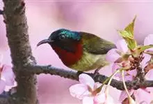 黑胸太阳鸟:小型鸟类,体长9-15厘米。嘴细长而向下曲。雄鸟中央尾羽特长,尾呈楔形,头顶至后颈紫蓝色具金属光泽;背褐红色,腰有一黄色横带,尾上覆羽和尾紫蓝色;颏、喉和上胸乌黑色,有的下胸为硫黄色,…全部>>