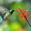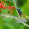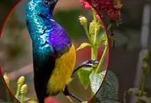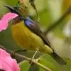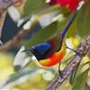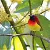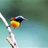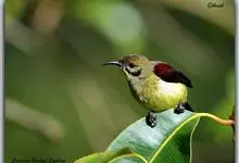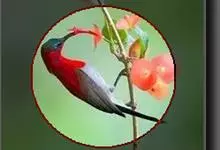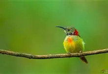 绿喉太阳鸟:共有9个亚种。小型鸟类,雄鸟体长13-15厘米、雌鸟10-12厘米。雄鸟前额至后颈、颏和喉辉绿色,头侧黑色,颈侧和背暗红色,两肩、下背橄榄绿色,腰鲜黄色,尾上覆羽和中央尾羽暗绿色,…全部>>