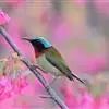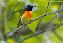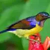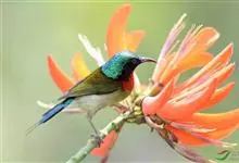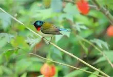 绿喉太阳鸟:共有9个亚种。小型鸟类,雄鸟体长13-15厘米、雌鸟10-12厘米。雄鸟前额至后颈、颏和喉辉绿色,头侧黑色,颈侧和背暗红色,两肩、下背橄榄绿色,腰鲜黄色,尾上覆羽和中央尾羽暗绿色,…全部>>