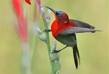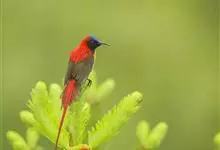 火尾太阳鸟为太阳鸟科太阳鸟属的鸟类。体长20厘米,色彩艳丽。雄鸟红色,具形长的艳猩红色中央尾羽。头顶金属蓝色,眼先和头侧黑色,喉及髭纹金属紫色。下体黄色,胸具艳丽的橘黄色块斑。雌鸟灰橄榄色,腰黄,…全部>>