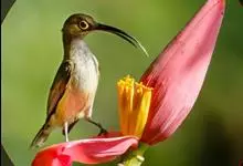 绿喉太阳鸟:共有9个亚种。小型鸟类,雄鸟体长13-15厘米、雌鸟10-12厘米。雄鸟前额至后颈、颏和喉辉绿色,头侧黑色,颈侧和背暗红色,两肩、下背橄榄绿色,腰鲜黄色,尾上覆羽和中央尾羽暗绿色,…全部>>