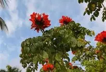 火焰树是紫葳科、火焰树属乔木,树皮平滑,灰褐色。奇数羽状复叶,对生,连叶柄长达45厘米;小叶13-17枚,叶片椭圆形至倒卵形,伞房状总状花序,顶生,密集;被褐色微柔毛,具有明显的皮孔;花冠一侧膨大,…全部>>
