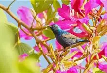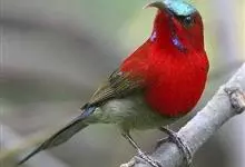 叉尾太阳鸟,雀形目太阳鸟科太阳鸟属留鸟;为小型鸟类,雄鸟头顶辉蓝绿色,上体橄榄绿色,腰明黄色,中央尾羽亮翠蓝色,羽轴针状延长,外侧尾羽黑色具白色端斑,头侧黑色,颜、喉和胸为绛红色,…全部>>