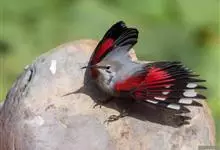 红翅旋壁雀:体重15-23克,体长120-178毫米。是一种体型略小的鸟类。尾短而嘴长,翼具醒目的绯红色斑纹。飞羽黑色,外侧尾羽羽端白色显著,初级飞羽两排白色点斑飞行时成带状。繁殖期雄鸟脸及喉黑色,…全部>>