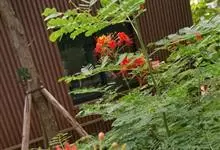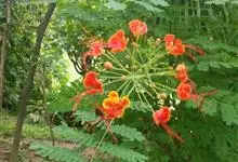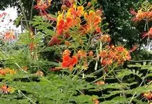 洋金凤 Sw.),豆科小凤花属灌木状或小乔木植物,枝无毛,绿或粉绿色;二回羽状复叶;总状花序伞房状,萼片无毛,花瓣橙红或黄色,圆形,花丝红色,子房无毛,花柱橙黄色;荚果窄而薄,…全部>>