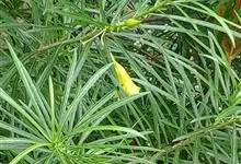 黄花夹竹桃K. Schum.),又名“酒杯花”“柳木子”“黄花状元竹”,是夹竹桃科,黄花夹竹桃属下的常绿乔木植物。高达5m,全株无毛,树皮棕褐色;叶互生,近革质,线形或线状披针形;花大,黄色,具香味,…全部>>