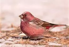 藏朱雀:全长约17-18厘米。雄鸟头部深红色具光辉,喉部暗红色具白色点斑;背部灰白色,各羽具玫瑰红色羽端,形成许多斑纹;腰部淡玫瑰红色;翅暗褐色,沾灰白,羽端沾玫瑰红或灰白色;尾暗棕色,端缘玫瑰红色…全部>>