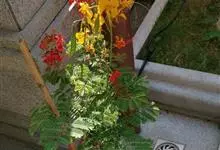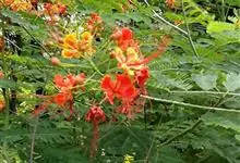 洋金凤 Sw.),豆科小凤花属灌木状或小乔木植物,枝无毛,绿或粉绿色;二回羽状复叶;总状花序伞房状,萼片无毛,花瓣橙红或黄色,圆形,花丝红色,子房无毛,花柱橙黄色;荚果窄而薄,…全部>>