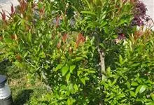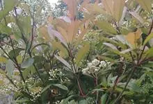 石楠 Kalkman),是蔷薇科石楠属的常绿乔木,高5~12米,株型紧凑,树冠圆球形。树枝为褐灰色;鳞片为褐色,没有毛;叶片革质,长椭圆至侧卵状椭圆形,有锯齿,新叶红色光亮。复伞房花序,白色小花,…全部>>