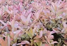 红叶石楠 是蔷薇科,石楠属杂交种,为常绿小乔木或灌木,乔木高可达5米、灌木高可达2米。叶片革质,长圆形至倒卵状、披针形,叶端渐尖,叶基楔形,叶缘有带腺的锯齿,花多而密,复伞房花序,花白色,梨果黄红色,…全部>>