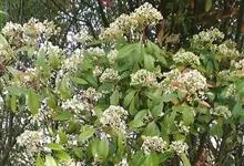 石楠 Kalkman),是蔷薇科石楠属的常绿乔木,高5~12米,株型紧凑,树冠圆球形。树枝为褐灰色;鳞片为褐色,没有毛;叶片革质,长椭圆至侧卵状椭圆形,有锯齿,新叶红色光亮。复伞房花序,白色小花,…全部>>