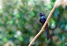 发冠卷尾是中型鸟类,体长28-35厘米。通体绒黑色缀蓝绿色金属光泽,额部具发丝状羽冠,外侧尾羽末端向上卷曲。栖息于海拔1500米以下的低山丘陵和山脚沟谷地带,多在常绿阔叶林、次生林或人工松林中活动。…全部>>