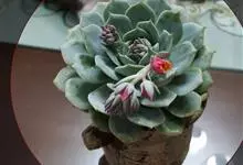 红缘莲花掌属蔷薇目、景天科植物,原产大西洋的加那利群岛。质厚,蓝绿色,被白霜,叶缘红褐色。聚伞花序,花浅黄色,有时带红晕。叶形叶色较美,有一定的观赏价值,多盆栽用于点缀室内;可放置于电视、电脑旁,…全部>>