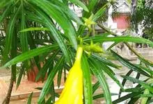 黄花夹竹桃K. Schum.),又名“酒杯花”“柳木子”“黄花状元竹”,是夹竹桃科,黄花夹竹桃属下的常绿乔木植物。高达5m,全株无毛,树皮棕褐色;叶互生,近革质,线形或线状披针形;花大,黄色,具香味,…全部>>