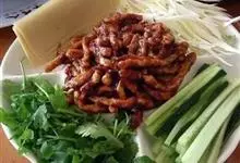 京酱肉丝,是一道知名度很高的菜肴,它是北京菜中的经典代表菜之一。制作时选用猪瘦肉为主料,辅以甜面酱、葱、姜及其它调料,用北方特有烹调技法“六爆”之一的“酱爆”烹制而成。 成菜后,咸甜适中,酱香浓郁…全部>>
