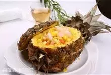 菠萝炒饭是将带皮菠萝纵切,用勺子将菠萝肉取出,切成小丁,与米饭、火腿、鸡蛋、新鲜蔬菜等一起在油锅中翻炒,…全部>>