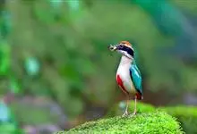 绿胸八色鸫:是雀形目八色鸫科的鸟类,共有12个亚种。体长为16-18厘米,体重65-69克。体型圆胖,尾短,腿长。头黑,上体绿色,两翼深色而具白色斑纹,头顶至后枕深褐,胸及腹部苹果绿,臀亮红。…全部>>