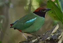 绿胸八色鸫:是雀形目八色鸫科的鸟类,共有12个亚种。体长为16-18厘米,体重65-69克。体型圆胖,尾短,腿长。头黑,上体绿色,两翼深色而具白色斑纹,头顶至后枕深褐,胸及腹部苹果绿,臀亮红。…全部>>