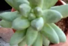 景天科风车草属的多肉植物,原产于墨西哥。株形和风车草属胧月极为相似。花瓣被蜡,叶排成延长的莲座状被白粉。平时为绿色日照充足时叶色朱红带褐色,叶呈瓜子型叶末较尖,开黄色小花,星状。全部>>