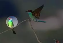 栗喉蜂虎是蜂虎科蜂虎属的鸟类。有热带鸟类羽毛艳丽的特征:喉部是栗红色的,黑色的过眼纹,翅膀和背部是绿色的,尾翼是蓝色的,飞行时翅膀下面的羽毛是橙黄色的,在阳光的照射下,它们全身闪烁着金属般的艳丽光泽,…全部>>