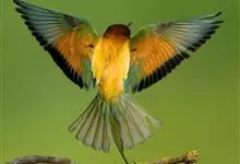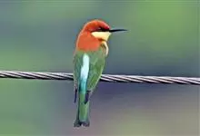栗喉蜂虎是蜂虎科蜂虎属的鸟类。有热带鸟类羽毛艳丽的特征:喉部是栗红色的,黑色的过眼纹,翅膀和背部是绿色的,尾翼是蓝色的,飞行时翅膀下面的羽毛是橙黄色的,在阳光的照射下,它们全身闪烁着金属般的艳丽光泽,…全部>>