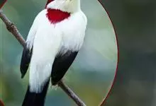 花冠皱盔犀鸟雄鸟体长约105厘米,雌鸟较小。尾白,雄雌两性的背、两翼及腹部均为黑色,但雄鸟头部奶白色,枕部具略红的丝状羽,裸出的喉囊上具明显的黑色条纹。雌鸟头颈黑,喉囊蓝色。成对或小群飞于森林上空,…全部>>