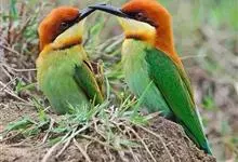 栗喉蜂虎是蜂虎科蜂虎属的鸟类。有热带鸟类羽毛艳丽的特征:喉部是栗红色的,黑色的过眼纹,翅膀和背部是绿色的,尾翼是蓝色的,飞行时翅膀下面的羽毛是橙黄色的,在阳光的照射下,它们全身闪烁着金属般的艳丽光泽,…全部>>