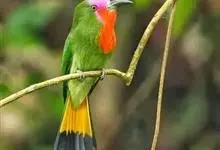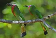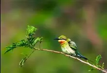 绿喉蜂虎是佛法僧目、蜂虎科的小型鸟类,共有9个亚种。身长22-25厘米,翼展29-30厘米,体重15-20克。喉绿色,额部、头顶至上背为锈红色,其余上体均为亮绿色。中央尾羽延长且端段狭细,…全部>>