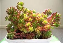 虹之玉是景天科景天属的多肉植物,多年生肉质草本植物。生长速度较快,叶片肉质,呈长椭圆形,约1厘米长,互生。花黄色,星形,秋冬季节或强光照下,叶片部分或全部转为鲜红色。生长适温10~28℃,…全部>>