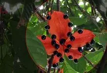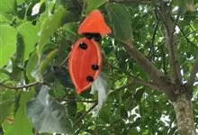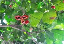假苹婆是锦葵科苹婆属乔木植物。幼枝被毛;叶椭圆形或披针形,先端骤尖,基部钝或近圆无毛;圆锥花序腋生,花淡红色;蓇葖果鲜红色,长卵圆形或长椭圆形;种子卵圆形黑褐色;花期4-6月。…全部>>