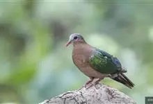 绿背金鸠体长约25厘米,是中等体型、尾甚短的地栖型斑鸠。下体粉红,头顶灰色,额白,腰灰,两翼具亮绿色。雌鸟头顶无灰色。飞行时背部两道黑色和白色的横纹清晰可见。主要栖息于2000米以下的山地森林中,…全部>>