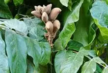 十字架树是紫葳科、葫芦树属小灌木,高3-6米。叶簇生于小枝上;小叶长倒披针形至倒匙形,几无柄,叶柄具阔翅。花1-2朵生于小枝或老茎上;花梗长约1厘米。花萼淡紫色。花冠褐色,具有紫褐色脉纹,近钟状,具…全部>>