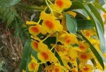 束花石斛是兰科石斛属植物。茎粗厚,肉质,下垂或弯垂,圆柱形,不分枝,具多节。叶二列,互生于整个茎上,纸质,长圆状披针形。伞状花序近无花序柄,每2-6花为一束,侧生于具叶的茎上部;花黄色,…全部>>
