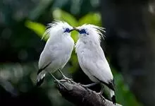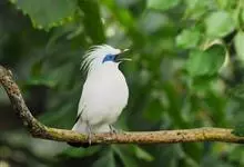 长冠八哥:是一种大型椋鸟,体长约25厘米,雌雄相似,外形俊朗,羽冠发达,眼睛四周和面部裸出,裸露部分为蓝色,全身羽毛纯白色,尾部和翼端的边缘呈黑色,脚灰色。全身白色,具较长冠羽,…全部>>
