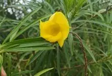 黄花夹竹桃K. Schum.),又名“酒杯花”“柳木子”“黄花状元竹”,是夹竹桃科,黄花夹竹桃属下的常绿乔木植物。高达5m,全株无毛,树皮棕褐色;叶互生,近革质,线形或线状披针形;花大,黄色,具香味,…全部>>