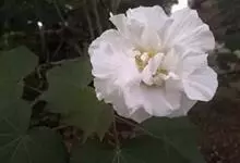 木芙蓉,锦葵科木槿属落叶灌木或小乔木。小枝上有细绒毛;叶片为卵状心形,托叶为披针形,常早落;花单生,花萼为钟形,花冠初为白色或淡红色,后逐渐变为深红色;果实为扁球形,有淡黄色的毛附着。花期8到10月。…全部>>