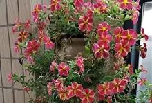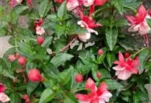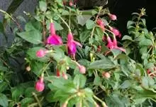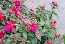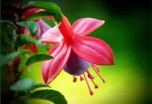 倒挂金钟是柳叶菜科倒挂金钟属亚灌木植物。茎直立,多分枝;幼枝带红色,被短柔毛与腺毛,老时渐无毛;叶对生,卵形或窄卵形,脉常带红色;常带红色,被短柔毛与腺毛;花筒红色,筒状钟形,…全部>>