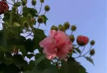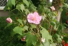木芙蓉,锦葵科木槿属落叶灌木或小乔木。小枝上有细绒毛;叶片为卵状心形,托叶为披针形,常早落;花单生,花萼为钟形,花冠初为白色或淡红色,后逐渐变为深红色;果实为扁球形,有淡黄色的毛附着。花期8到10月。…全部>>