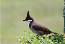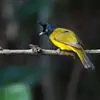 黑冠黄鹎:体长18-21厘米,是一种中等体型偏黄色鹎。整个头、颈、颏、喉黑色,头顶有显著直立的羽冠,黑色,上体褐橄榄黄绿色,下体橄榄黄色。虹膜偏红;嘴及脚黑色。…全部>>