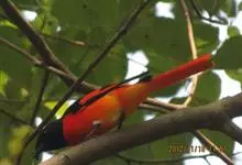 灰喉山椒鸟:共有8个亚种。体长18-22厘米。雄鸟头部和背亮黑色,腰、尾上覆羽和下体朱红色,翅黑色具一大一小的两道朱红色翼斑。中央尾羽黑色,外侧尾羽基部黑色,端部红色。…全部>>