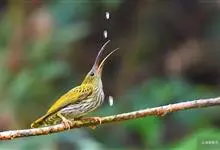 纹背捕蛛鸟:为太阳鸟科捕蛛鸟属的鸟类。是太阳鸟科中体型较大的一种,体重25-45克,体长160-210毫米。嘴粗长而尖且向下弯曲。上体橄榄黄色具黑色中央斑纹。下体淡黄白色满布黑色纵纹,尾具黑色次端斑。…全部>>
