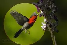 火尾太阳鸟为太阳鸟科太阳鸟属的鸟类。体长20厘米,色彩艳丽。雄鸟红色,具形长的艳猩红色中央尾羽。头顶金属蓝色,眼先和头侧黑色,喉及髭纹金属紫色。下体黄色,胸具艳丽的橘黄色块斑。雌鸟灰橄榄色,腰黄,…全部>>