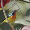 绿喉太阳鸟:共有9个亚种。小型鸟类,雄鸟体长13-15厘米、雌鸟10-12厘米。雄鸟前额至后颈、颏和喉辉绿色,头侧黑色,颈侧和背暗红色,两肩、下背橄榄绿色,腰鲜黄色,尾上覆羽和中央尾羽暗绿色,…全部>>