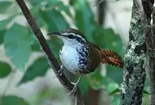 鹪鹩属:是一类小型鸣禽,身长在10-17厘米之间。头部浅棕色,有黄色眉纹;上体连尾带栗棕色,布满黑色细斑;两翼覆羽尖端为白色。整体棕红褐色,胸腹部颜色略浅,翅膀有深色波形斑纹,嘴长直而较细弱,先端稍曲,…全部>>