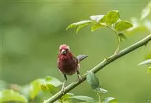 普通朱雀是雀形目雀科朱雀属鸟类,又名红朱雀、马料、青麻料。雄鸟上体红色,下体淡红色;头部、喉部、胸部及腰部亮红色;背部褐色染红色;两翼及尾黑褐色,羽缘染红色。雌鸟上体橄榄褐色,下体近白色,…全部>>