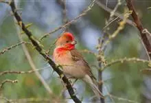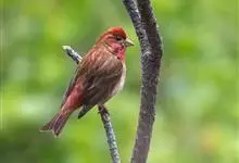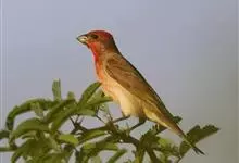 普通朱雀是雀形目雀科朱雀属鸟类,又名红朱雀、马料、青麻料。雄鸟上体红色,下体淡红色;头部、喉部、胸部及腰部亮红色;背部褐色染红色;两翼及尾黑褐色,羽缘染红色。雌鸟上体橄榄褐色,下体近白色,…全部>>