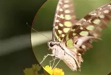 青带凤蝶Graphium sarpedon ,又名青凤蝶,是最普遍的中型凤蝶,飞行速度很快。青带凤蝶的翅膀中央有许多浅蓝色的斑点,很整齐地排列成一条直线。这些斑点由上而下逐渐变大,就像一条青色的带子。全部>>