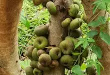 大果榕是桑科榕属的小乔木,株高可达10米;幼枝被柔毛;叶互生,宽卵状心形或近圆形;雄花无梗、匙形、花丝长,雌花生于雌株榕果内,子房白色;榕果簇生于树干基部或老茎短枝上、扁球形或陀螺形,…全部>>