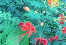 洋金凤 Sw.),豆科小凤花属灌木状或小乔木植物,枝无毛,绿或粉绿色;二回羽状复叶;总状花序伞房状,萼片无毛,花瓣橙红或黄色,圆形,花丝红色,子房无毛,花柱橙黄色;荚果窄而薄,…全部>>